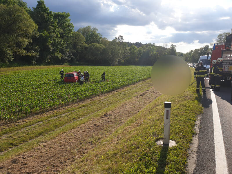 In den Abendstunden wurden wir gemeinsam mit der FF Fürstenfeld zu einem Verkehrsunfall gerufen. Ein Lenker war mit seinem Fahrzeug aus ungeklärter Ursache von der Straße abgekommen und das Fahrzeug überschlug sich beim Sturz über eine etwa zwei Meter höhe Böschung. Nach dem Überschlag kam das Fahrzeug auf den Rädern in einem Maisacker zu stehen.